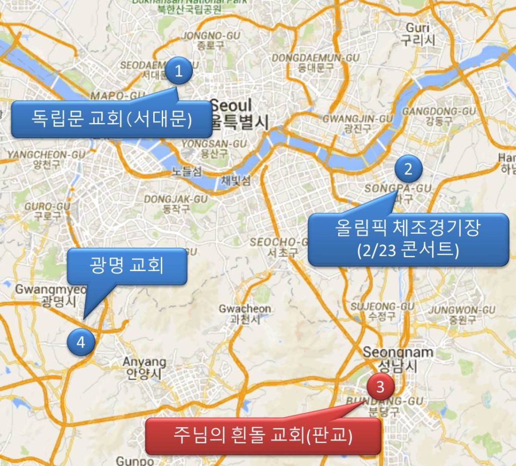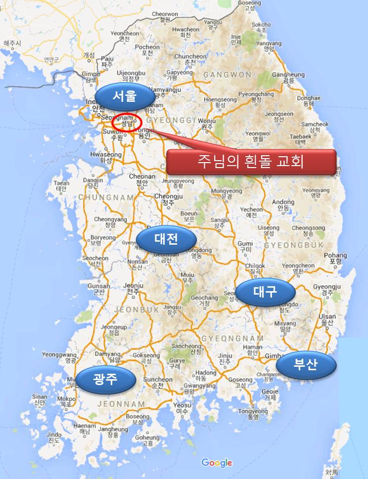 ③が판교(パンギョ)にある주님의 흰돌 교회(チュニメヒンドル教会)です。